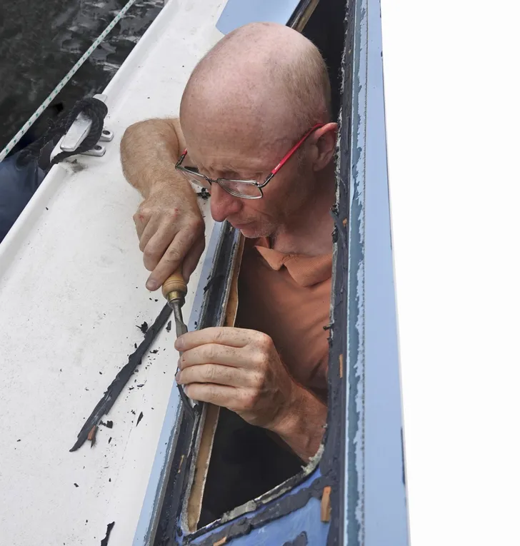 Lang geleden, toen ik mijn boot kocht, waren alle ruiten na twaalf jaar zon op de Kanaaleilanden craquelé. Dat is constructief geen probleem, maar bederft wel het uitzicht en laat minder licht binnen. De bevestiging van de ramen (een hele reeks bouten) zag er op het eerste gezicht nog wel robuust uit, maar mijn opgedane bootwijsheid vertelde mij dat elk gat, met of zonder bout, in de loop van de tijd gaat lekken. Bij een aantal van die gaatjes was de raam-kit-bout- combinatie al over de datum en hingen er regelmatig druppels aan de binnenkant.