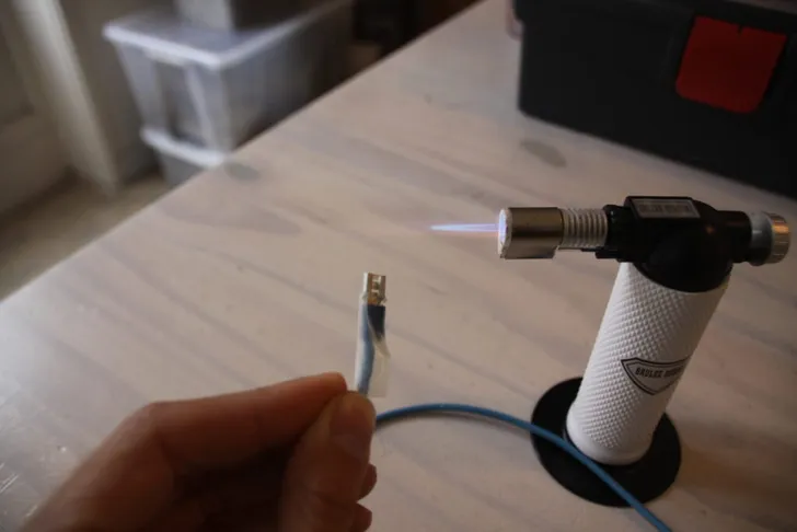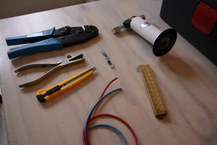 Met betrekking tot gereedschap zijn er veel opties. Een scherpe schaar knipt netter dan een ordinaire kniptang en strippen gaat – mits voorzichtig uitgevoerd – met een goedkope tang of met een stanleymes ook goed. Alleen voor het krimpen van de kabelschoen kun je er niet onderuit. Een goede krimptang heeft een ratel en is verkrijgbaar vanaf twee tientjes. Voor geïsoleerde kabelschoenen gebruik je een dubbel krimpende tang, voor kabelschoenen met lijmende krimpkous het liefst een enkel krimpende, omdat de tang de krimpkous kan beschadigen. Het krimpen van de kous kan het best met een heteluchtpistool. Heb je die niet, dan kan een brander uitkomst bieden. Houd voldoende afstand van de vlam om oververhitting te voorkomen.