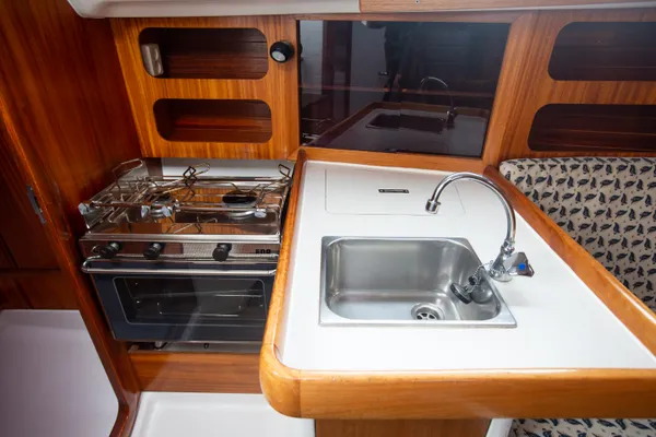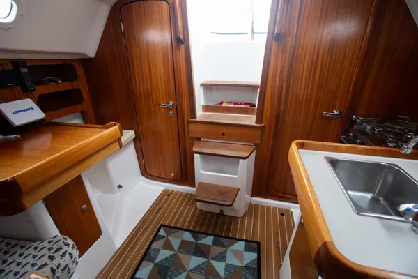 De kajuittafel zit stevig vast en is ook nuttig in opgeklapte toestand (slinggerrandje aanwezig). De kombuis is klein maar bruikbaar, net als de navigatiehoek. Alleen de zit is (letterlijk) onder de maat. In de sanitaire ruimte is een heuse natkast aangebracht, maar ook hier lijken niet de juiste slangen en/of aansluitingen gebruikt: het stinkt.