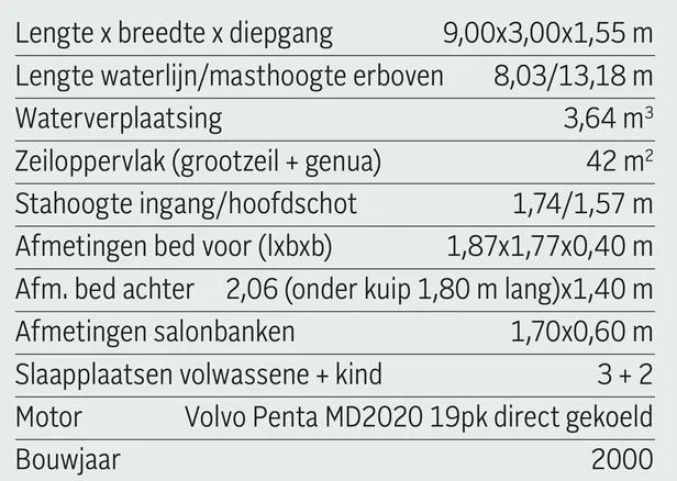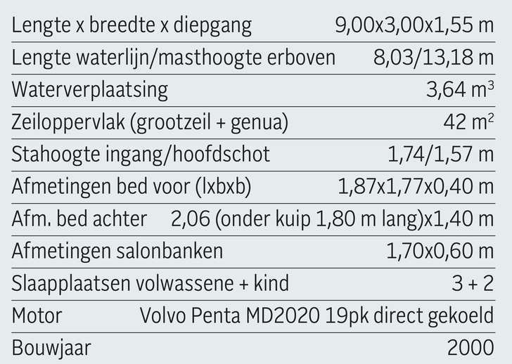 Het eerste dat opvalt als we bij de Dufour binnenlopen, is het formaat. Deze boot is in tegenstelling tot de andere testboten maar 8,99 meter lang – en zo oogt hij ook. Deze in 1997 geïntroduceerde Dufour 30 Classic voldeed helemaal aan het beeld dat Michel Dufour voor ogen had bij oprichting van zijn werf in 1964: een relatief goedkope, degelijke en tamelijk snelle familiezeiler. De vanafprijs bij de introductie was met 47.512 gulden bijzonder concurrerend. Het exemplaar dat wij varen, staat te koop voor 29.000 euro en is in uitmuntende staat.