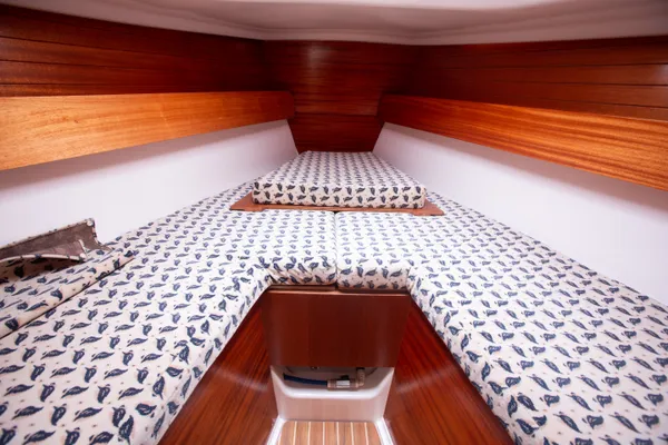 De motor en ander installatiewerk zijn goed bereikbaar. In de binnenschaal zijn uitsparingen gemaakt om het installatie werk te geleiden. Door het ontbreken van enige bekleding valt op dat het laminaat ter hoogte van de kuip erg dun is. Vanuit de hut kun je via een luikje in het achteronder komen, waar al wat water staat (dat gewoon tegen het houten schot kan blijven staan).