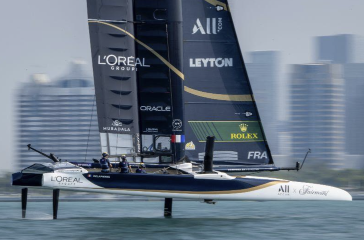De laatste SailGP van 2025 werd gevaren in Abu Dhabi, op een compact “stadionbaantje” vlak onder de skyline. Twee dagen racen, 29 en 30 november, in vooral lichtweer – vaak maar een knoop of zes. Foilen was meer uitzondering dan regel en de teams voeren met minimale bemanning om de F50’s überhaupt nog in de lucht te krijgen.