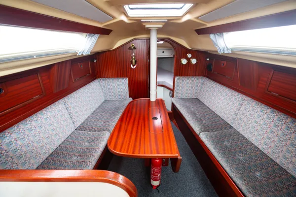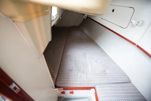 Het oudere rompontwerp van de Dehler omvat overhangen van meer dan een meter. De fijne lijnen in het voorschip zorgen voor een hoog en spits toelopend V-vormig bed in de punt, dat naar wens tot één bed kan worden gemaakt met een ‘puzzelstukje’. Wat betreft oppervlak is het bed groot genoeg voor in ieder geval één volwassene, maar houd er wel rekening mee dat de afstand tussen bed en plafond beperkt is (70 cm). Onder de gangboorden zijn kastjes geplaatst en onder de lange salonbanken is nog meer bergruimte. De rugleuning hangt op zwaartekracht aan een richeltje. Er is veel praktische opbergruimte en de elektronica is snel en goed bereikbaar.