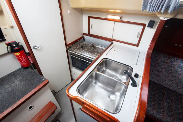 De kombuis beschikt over een kooktoestel, spoelbak en aardig wat bergruimte. De kraan is praktisch uitgevoerd als handdouche en de plaat voor over het fornuis kan eenvoudig erachter geschoven worden.