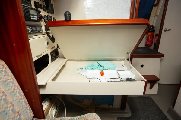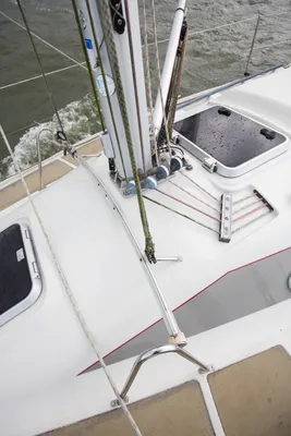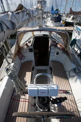 Met uitzondering van de onderlijkstrekker kun je alle lijnen vanuit de kuip bedienen. Het eenlijnsreefsysteem werkt uitstekend. Niet alle lijnen zijn even soepel of gang baar; de boot heeft duidelijk lang stil gelegen, getuige ook de laag algen op sommige lijnen.