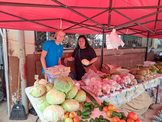 Op de markt hebben we even keuzestress door de vele kraampjes maar worden we uiteindelijk vaste klant bij een dame die ons zo vrolijk begroet dat we maar al te graag inkopen bij haar komen doen. We halen regelmatig kool, paprika, tomaat, aardappel, eieren, komkommer, papaya en ananas bij haar. Als we op het punt staan om te vertrekken naar Nieuw-Zeeland kopen we bij haar ook een flinke voorraad vers eten voor de overtocht. Het is een flinke lading en als dank voor de grote aankoop krijgen we nog een tros bananen en twee papaya’s cadeau. Nu hopen dat we alles op tijd op krijgen…