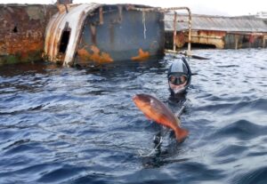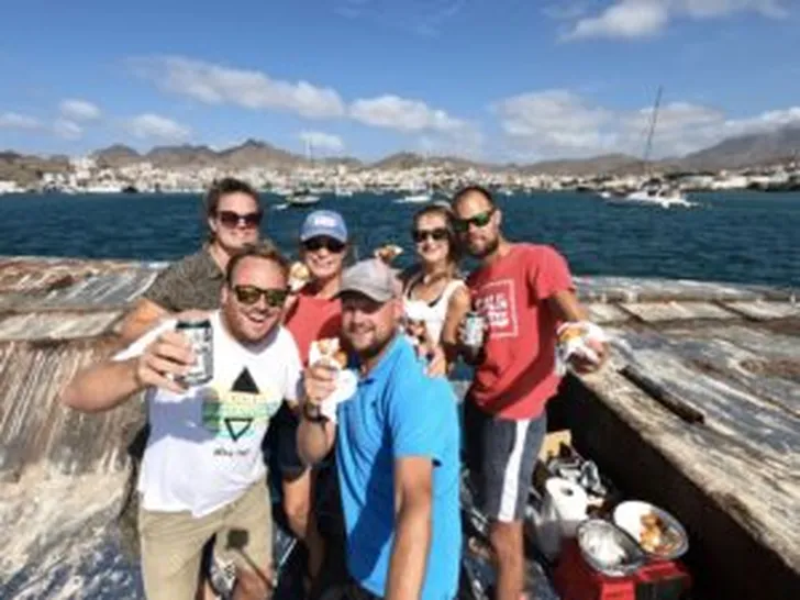 “Er moet wel oliebollen worden gebakken hoor,” roept Vera. Ze zorgt wel voor een beslag zegt ze, maar niemand wil hun boot ervoor opofferen. Niels komt met het ideale plan. “Wij hebben een campinggasstelletje en ik weet een ideale locatie.” Achter in de ankerbaai ligt een groot wrak, gekanteld op de bodem, zo zag hij tijdens het speervissen. En zo wordt op oudejaarsdag de grootste pan olie op het kleinste gasstelletje boven op het wrak de eerste cafetaria van de Kaapverdië geopend. We schrijven geschiedenis. En nu het vet toch heet is bakken we meteen frikandellen en frietjes. Echt heimwee voedsel. Dit keer hebben we wél een goede bodem gelegd voor de cocktails en uiteraard de champagne: gelukkig nieuwjaar!