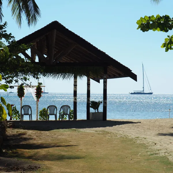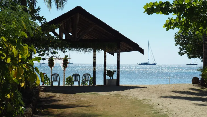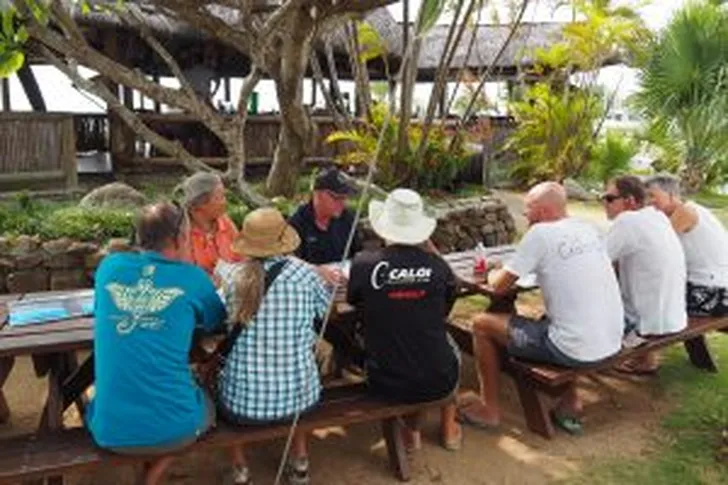 en de kleurige parachutes en kitezeilen aan de horizon zijn het levende bewijs. Er liggen aan deze kant van Fiji twee eilandengroepen: de Mananuca’s en de Yasawa groep. Op veel van deze eilanden staan resorts. Sommige van die vakantieparadijzen vinden de jachten wel leuk en leggen gastvrij meerboeien neer. Anderen hangen daarentegen een bordje op: ‘jachten wegwezen’. Wij zetten koers naar een iconische plek voor jachten: het resort Musket Cove. Al heel lang is dit een plek die je kennelijk gezien moet hebben. Best lastig om er te komen tussen allerlei riffen door. Als we dat achter de rug hebben, draaien we nieuwsgierig de baai in. Mijn mond valt open. Ik tel 53 masten op de ankerplaats! Het ligt bomvol. We tuffen wat rond en zwaaien links en rechts naar bekenden die we zien liggen. Met brede grijnzen wordt naar de strandbar gewezen en zes vingers opgestoken. Prompt komt er vlak bij de strandbar een meerboei vrij en liggen we op A1 locatie.