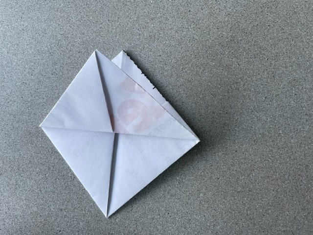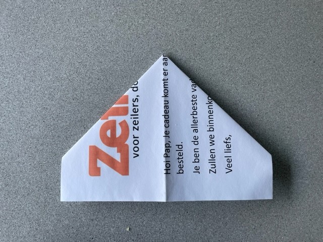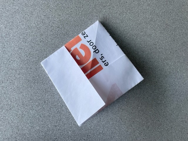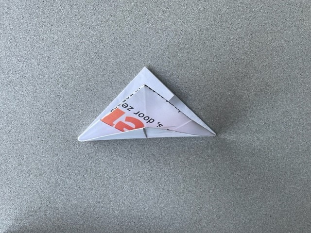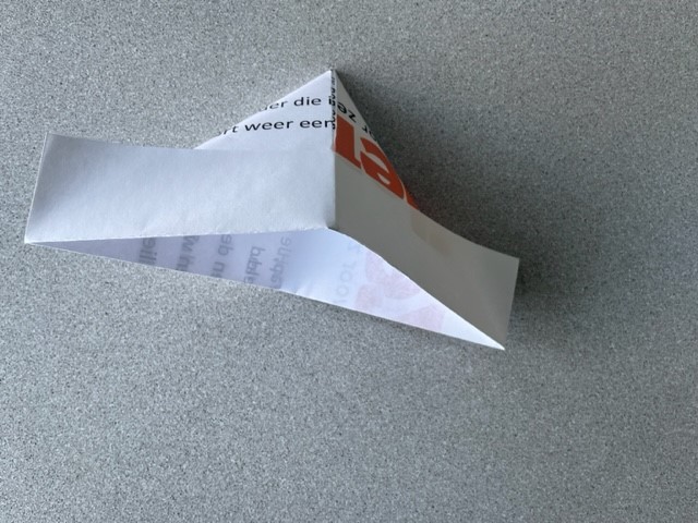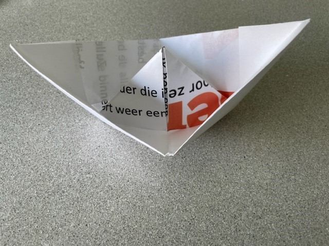 - Vouw het weer open en vouw de linker en rechterhoek naar binnen zodat een “zeil” ontstaat.