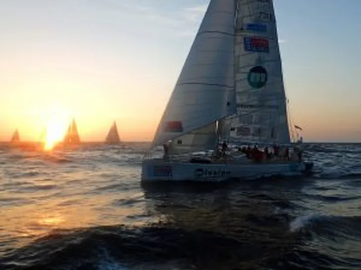 We zijn zojuist gestart in de twaalfde race, van New York naar Derry Londonderry Doire in Ierland, en de snelheid zit er meteen goed in. Met ruim elf knopen en alle boten in een lijn is het een heuse dragrace te noemen.